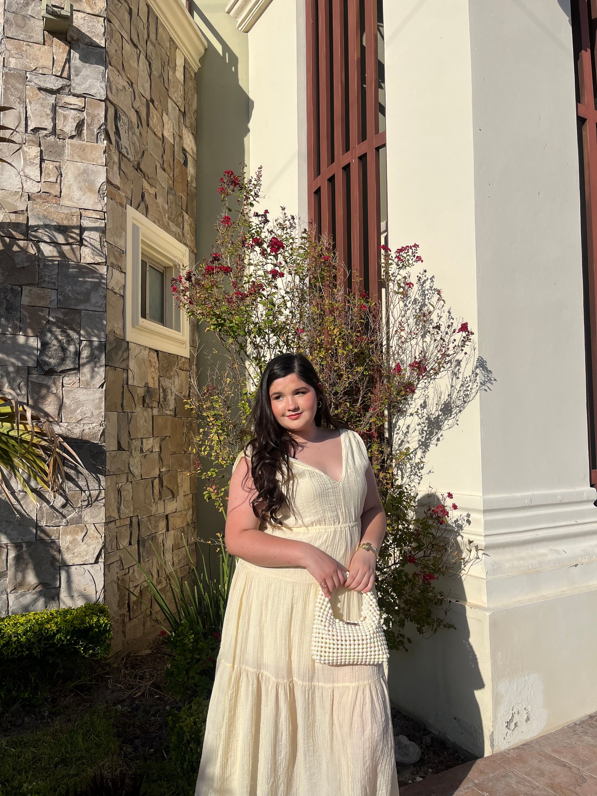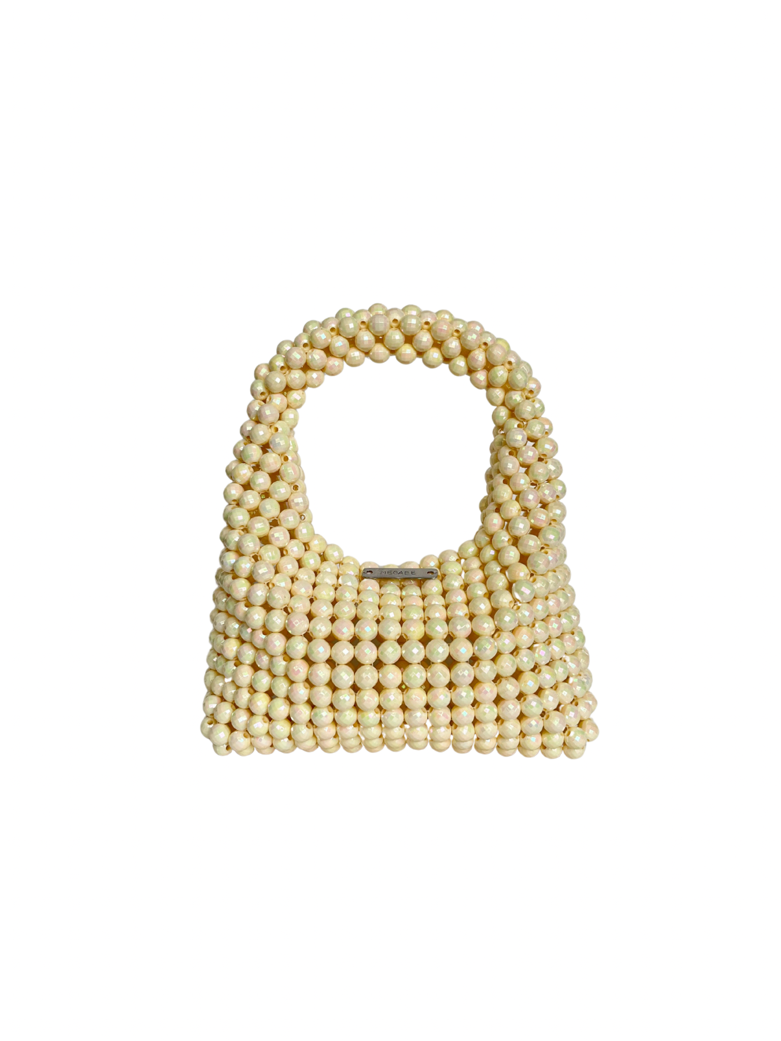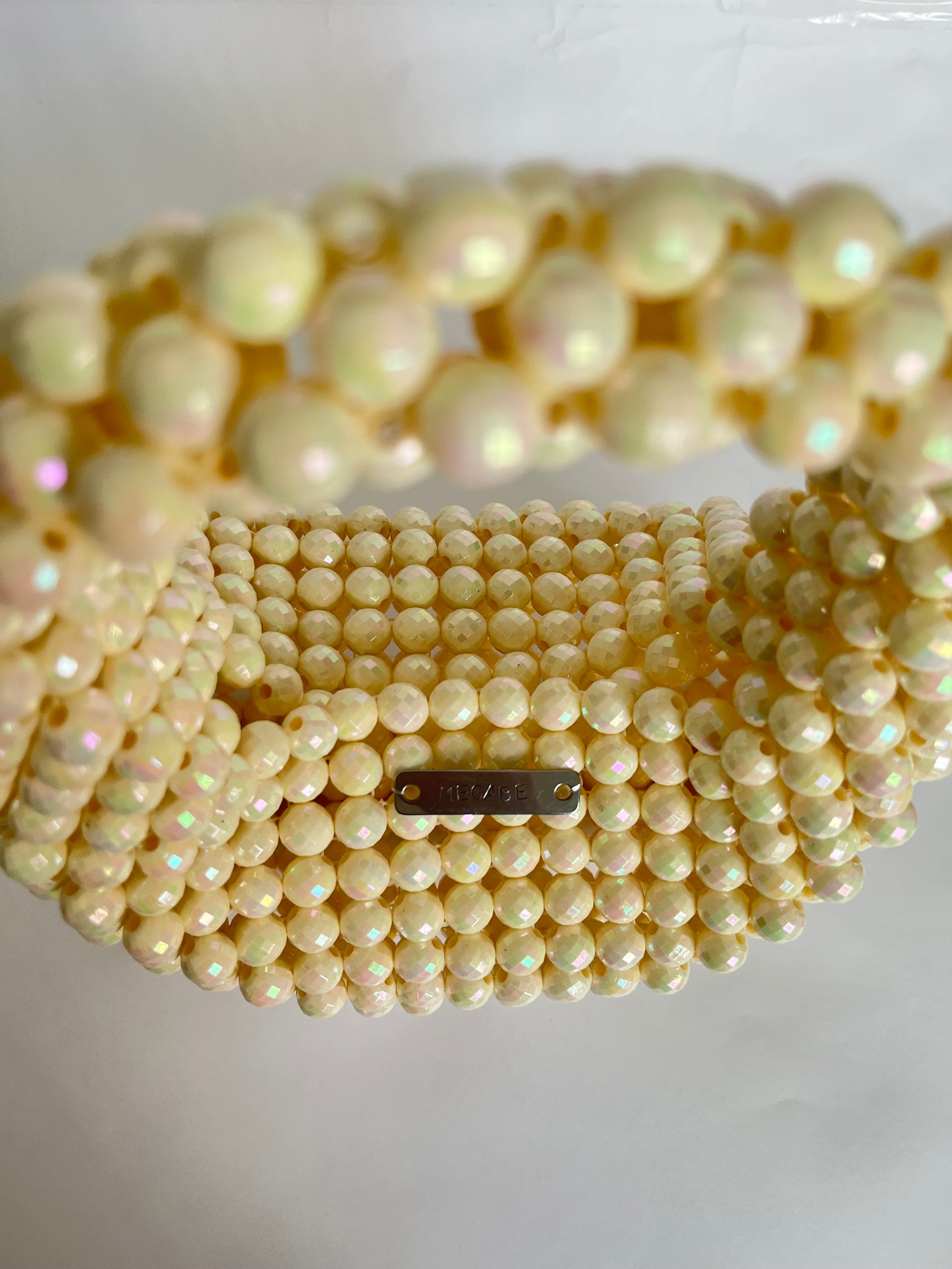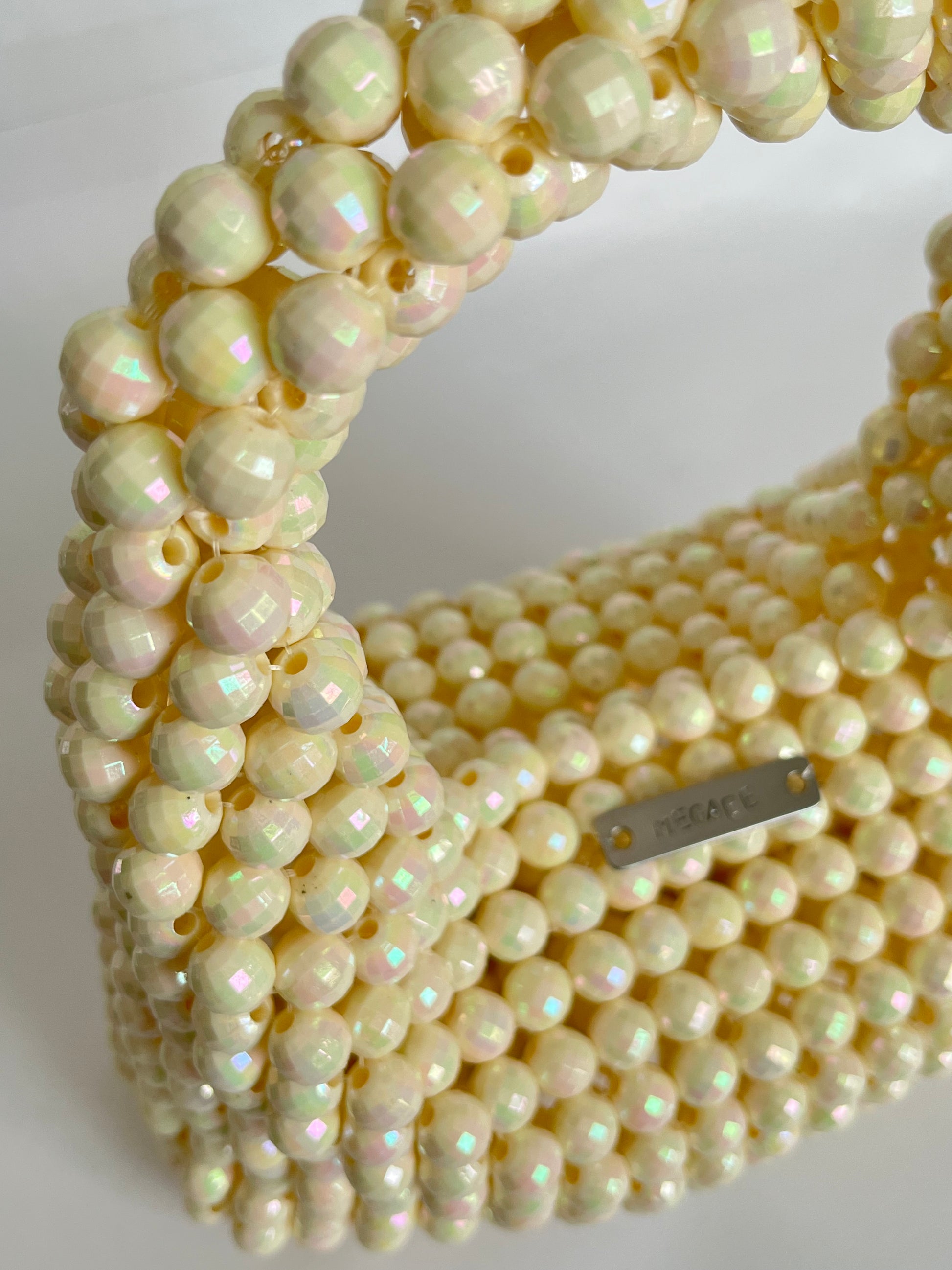 Bolso de cuentas acrílicas en forma curva con placa identificadora de marca